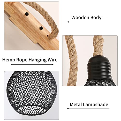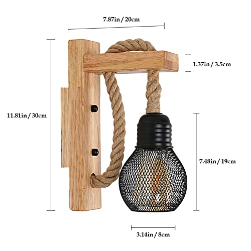 Specification: Applique Murale Industrielle Vintage, Lampe Murale en Bois Rustique Rétro, Abat-Jour en Cage en Métal Noir, Éclairage Mural à Suspendre en Corde de Chanvre pour Chambre, Salon (Sans Ampoules)