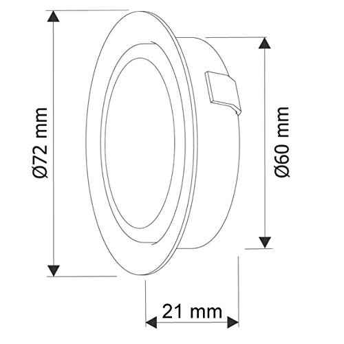 Dimensions – Ø extérieur 72 mm, Ø d’installation 60 mm, profondeur d’installation 21 mm s’adapte aux boîtes de commutation standard de 60 mm Câble de raccordement desserré de 8 cm chaque