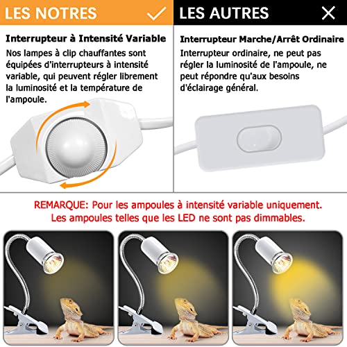 🐢【Interrupteur à Intensité Variable】Les lampes à clip ordinaires ne peuvent pas régler la luminosité de l’ampoule, il est donc très peu pratique à utiliser? Nos douille ampoule e27 à pince sont devenues des interrupteurs dimmables, vous pouvez choisir la luminosité d’éclairage dont vous avez besoin en fonction de vos besoins pour protéger vos yeux.La lampe clip peut également régler la température de la lampe lors du réchauffement des animaux, et lui donner la plus appropriée.