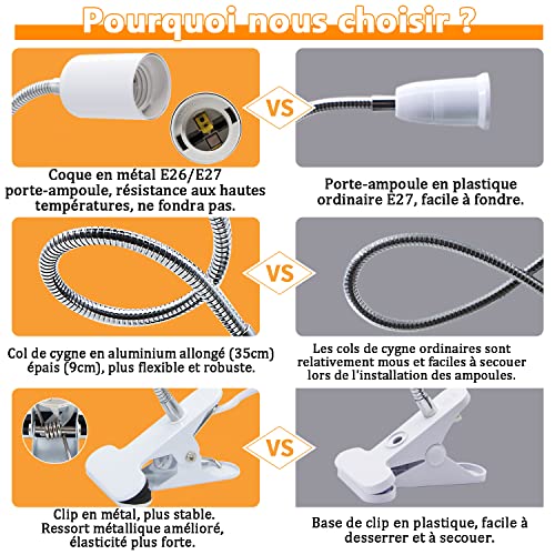 💡【Col de Cygne Audacieux et Plus Long】Les cols de cygne ordinaires sont fins et mous, et les bulbes trembleront.Le col de cygne a été mis à niveau d’un 30cm ordinaire à 35cm, et la longueur est augmentée,ce qui peut être plus pratique et flexible pour régler l’angle d’éclairage.Le diamètre du col de cygne a également été amélioré de 8cm à 9cm, ce qui est plus robuste et ne tremblera pas à gauche et à droite lors de l’installation de l’ampoule.